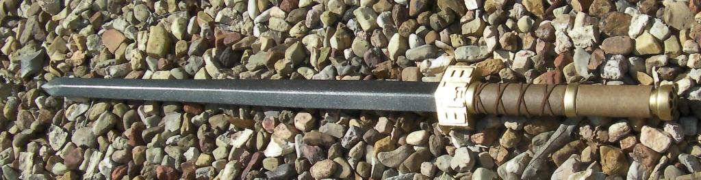 This replica is made from 3D printed PLA and ABS plastics, with an internal support rod, and leather and suede wraps for the grip.