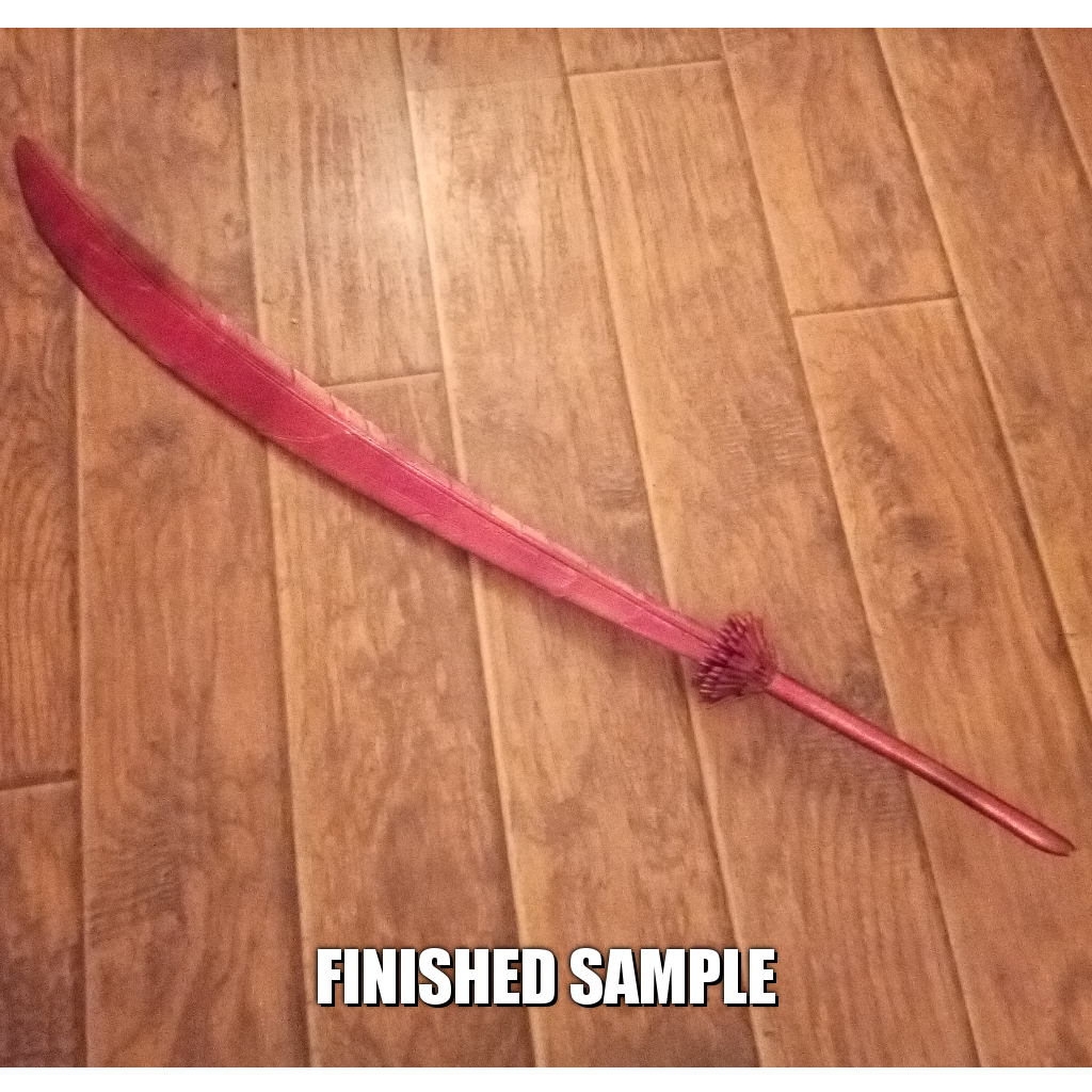 This prop is modeled and printed in all plastic, and is set up for an internal support rod, though that is not required. Assembly is straightforward, with 5 parts for the blade, 1 for the guard, and 1 for the grip. Prints for the blade sections require a support rod (3/16in thick 27.5" / 70cm), though the guard and grip do not.