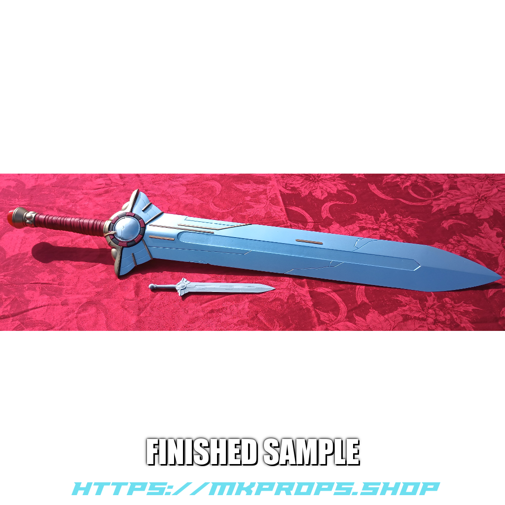 Overall size is approximately 106cm x 21cm x 5cm (42″ x 8″ x 2″). The kit is set up for ease of finishing and assembly, while the finished version comes fully painted and assembled. Blade measures approximately 78.5cm / 31" long, hilt measures approximately 16cm / 6.25" long.